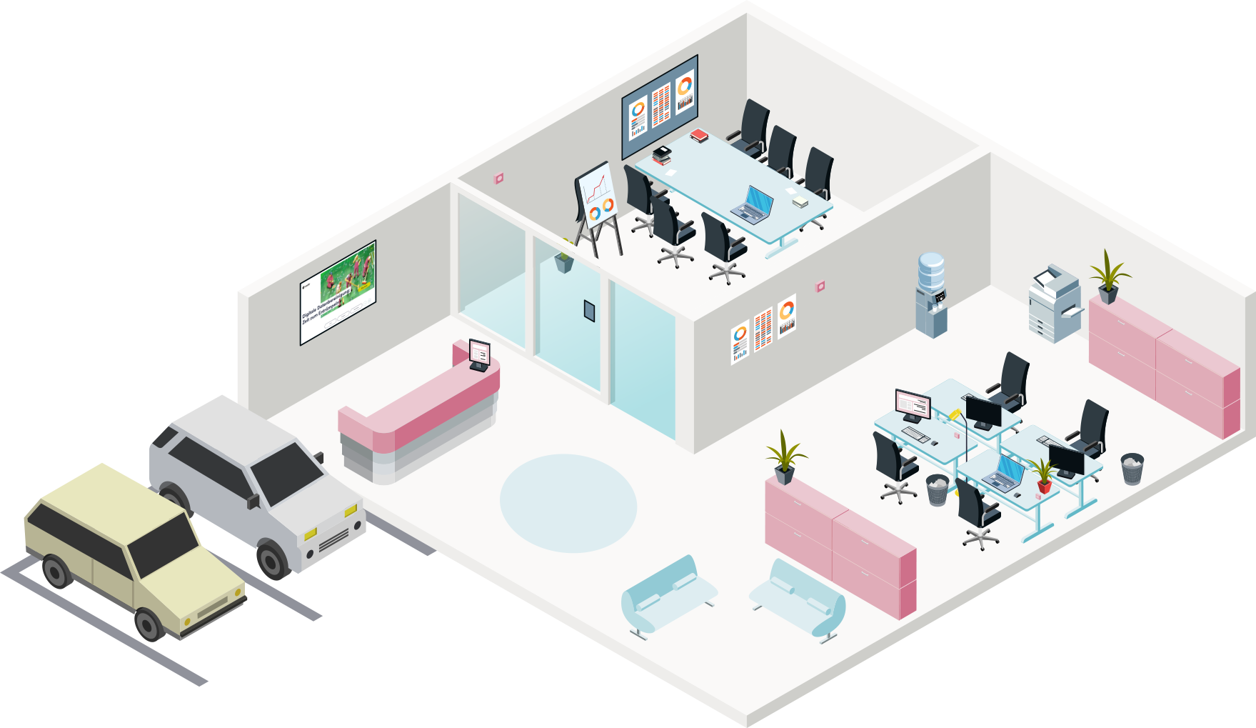 Modular können auch weitere Optionen hinzugefügt werden, wie Besuchermanagement, Digital Signage Lösungen, Konferenzlösungen, und vieles mehr.
